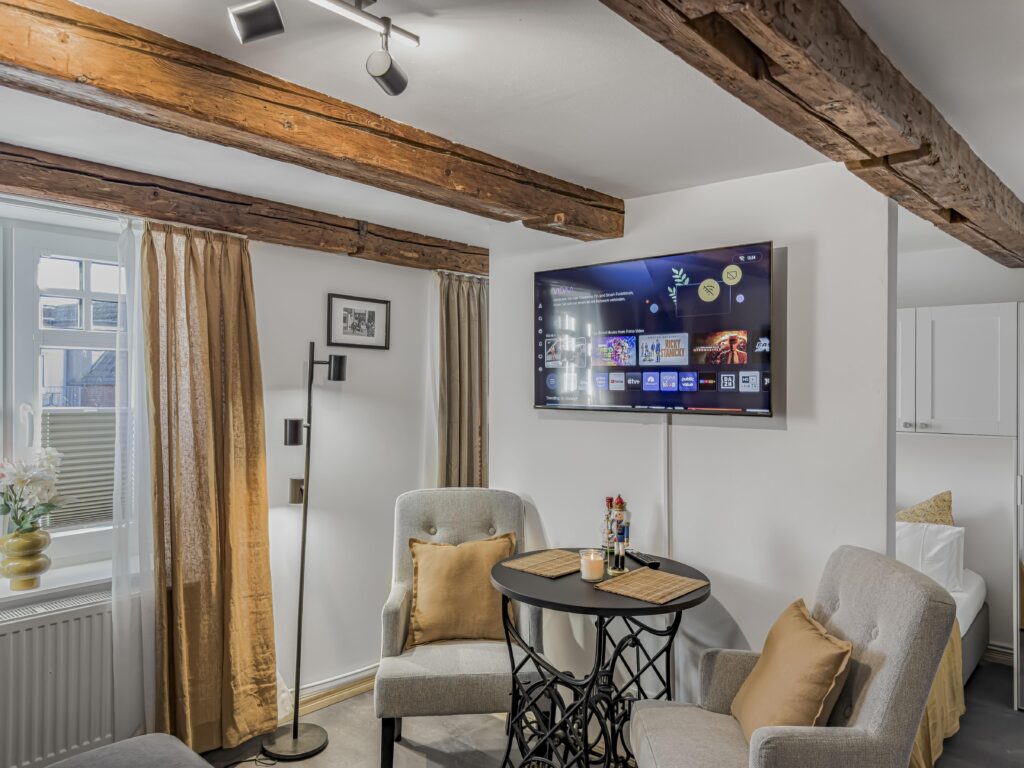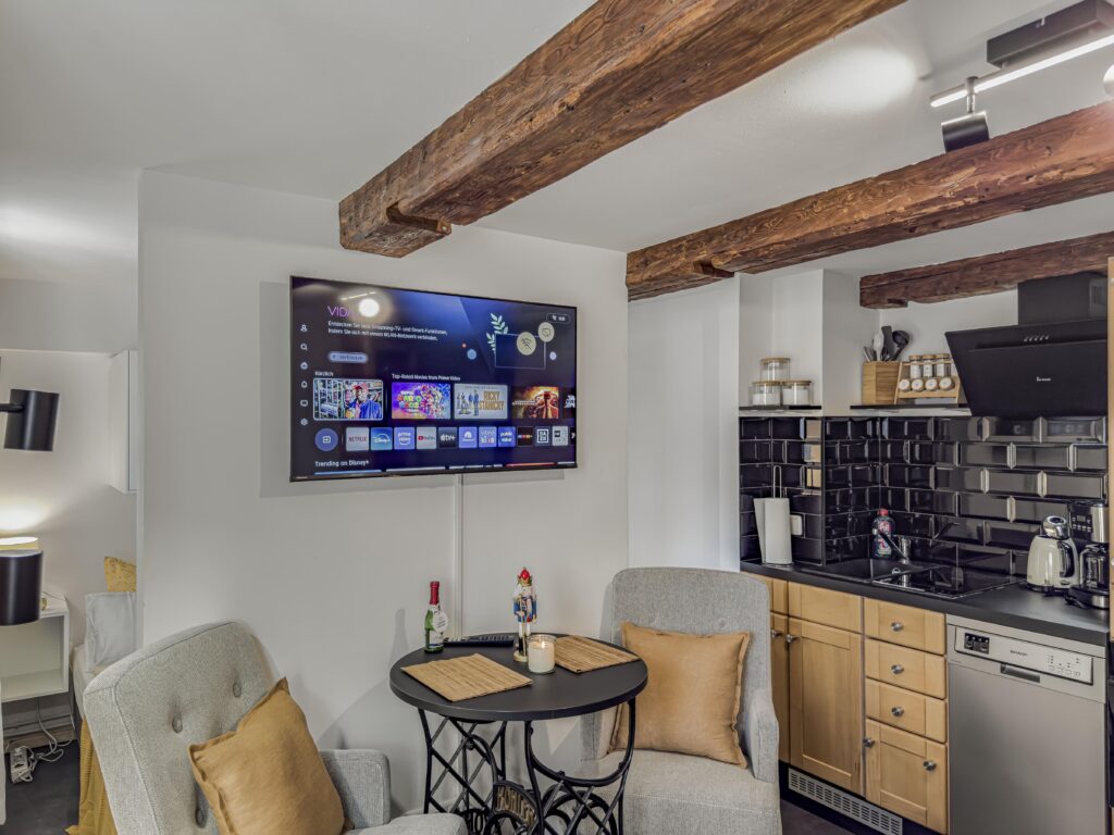 Dieses moderne 2-Zimmer-Apartment im 2. Obergeschoss bietet auf ca. 26 m² alles für einen komfortablen Aufenthalt. Das Schlafzimmer ist mit einem Doppelbett (1,60 m) ausgestattet, im Wohnbereich finden Sie ein Sofa und einen TV. Die Einbauküche verfügt über ein Induktions-Kochfeld, Backofen und Geschirrspüler – ideal für die Zubereitung eigener Mahlzeiten. Das Duschbad rundet das Apartment ab. Ein...Weiterlesene Waschküche mit Münzbetrieb steht ebenfalls zur Verfügung. Dank der zentralen Lage sind Einkaufsmöglichkeiten, Restaurants und Geschäfte nur wenige Schritte entfernt, und eine Busanbindung befindet sich direkt vor der Tür.Weniger lesen